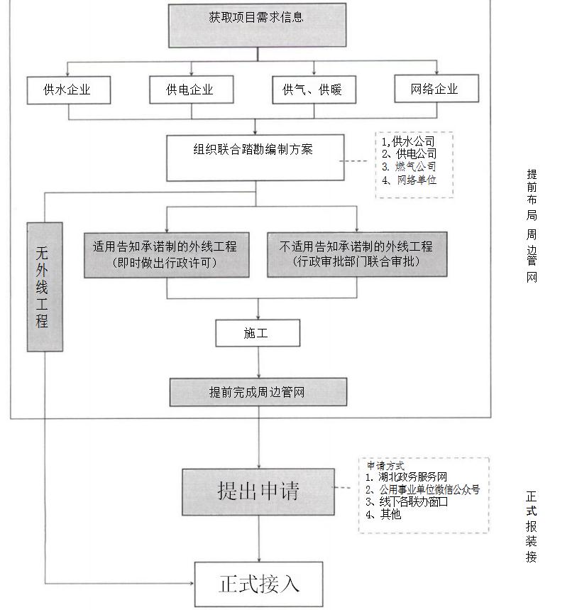 ( 一) 一 口登記早服務(wù)。 新建投資項目在土地出讓階段, 隨同填寫《用戶獲得水、電、氣、網(wǎng)、暖需求信息采集單》, 對新建項目施工和生產(chǎn)所需的用水、用電、用氣、用網(wǎng)、用暖 需求進(jìn)行意向登記。將項目報裝需求通過湖北政務(wù)服務(wù)網(wǎng)、工 改平臺傳遞給各公用事業(yè)單位,公用事業(yè)單位聯(lián)合上門對接, 根據(jù)用戶需求提前布局項目周邊區(qū)域管網(wǎng),為用戶后續(xù)獲得水、電、氣、網(wǎng)、暖接入作好準(zhǔn)備。